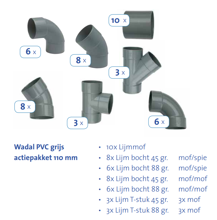 Actiepakket Wadal PVC 110mm lijmhulpstukken (44-delig) Wavin
