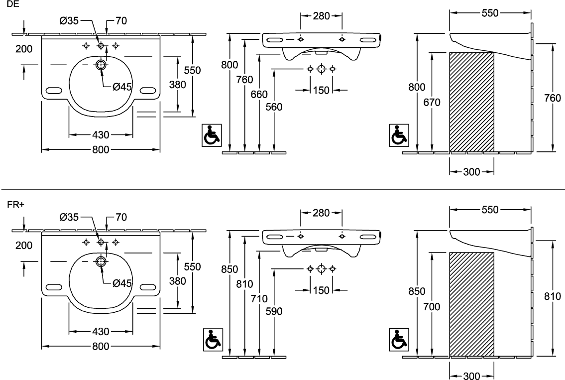 Rolstoelwastafel ViCare (O.novo Vita) ovaal 800x550mm wit Alpin met kraangat met overloop Villeroy & Boch
